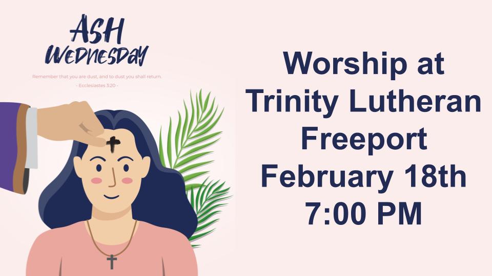 Ash Wednesday Worship will be at Trinity Lutheran Church of Freeport, February 18th, 7:00 PM.